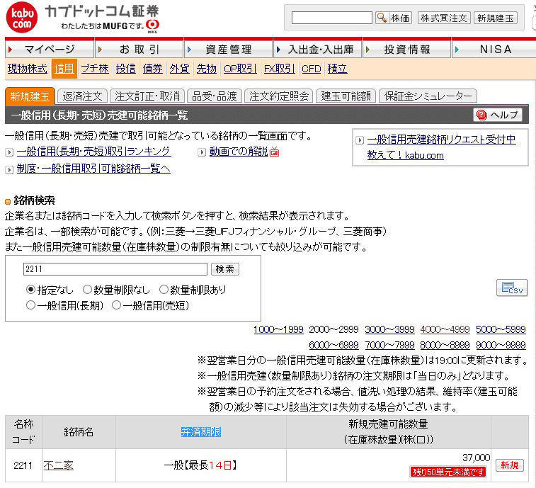 まず、11/18時点でカブコムで一般信用売りするには、売短しか在庫がない状態でした(長期は在庫なし)。