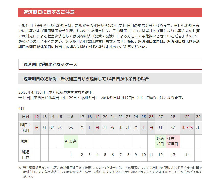 カブコム証券の説明では、「一般信用(売短)の返済期日は、新規建を行った日の14日目の応答日の前日までに反対決済を」となっているので、