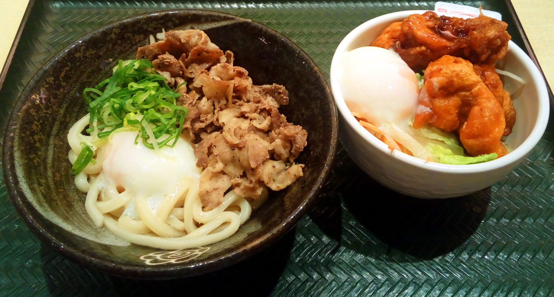※ミニ丼セット(ミニ丼+小うどん)→鶏の唐揚げ丼+塩豚温玉ぶっかけを(*^-^*)相方さんは牛肉ごはんのセットを(各730円)