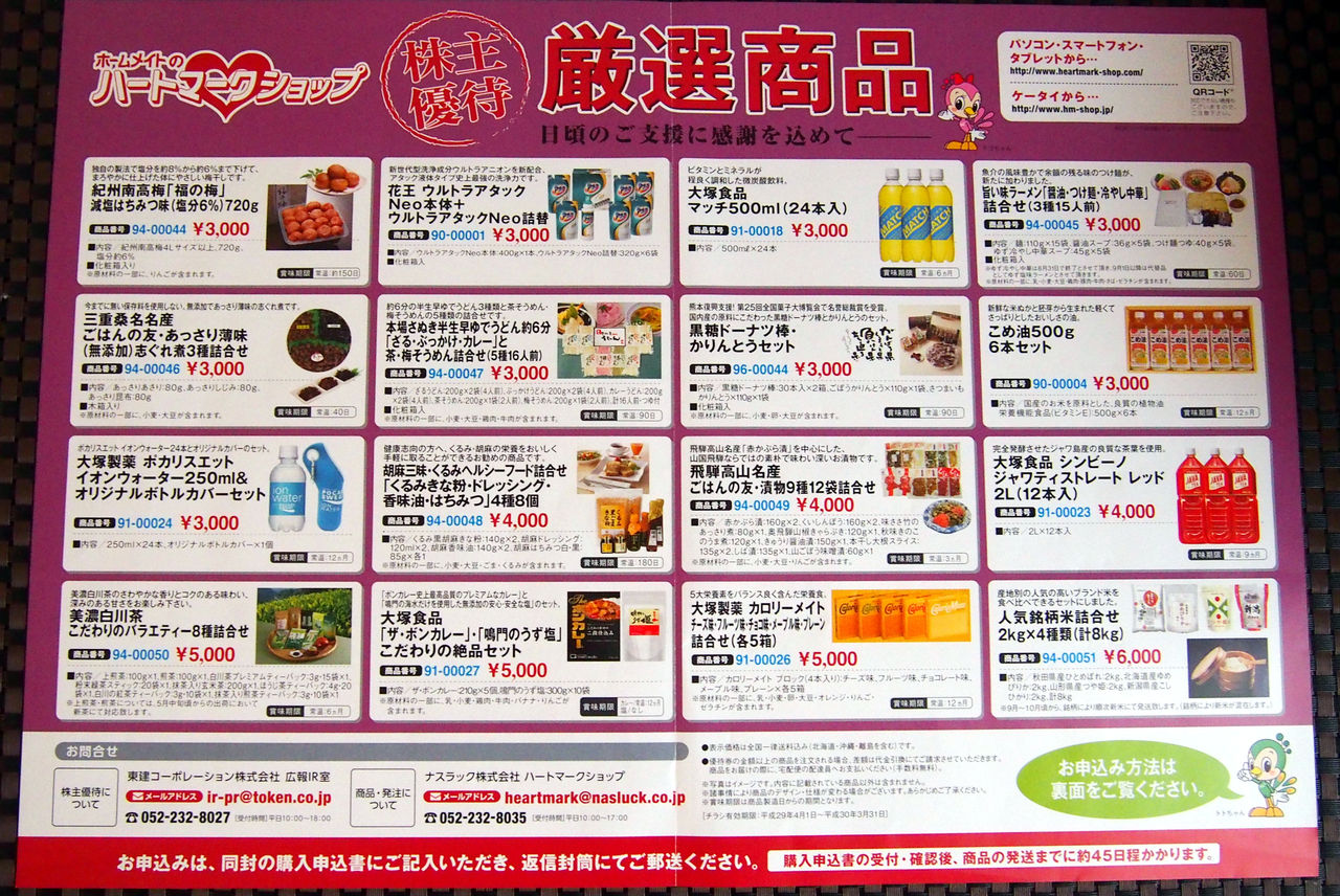 まず、同社の優待の内容は、年2回、10月権利は10株(端株)以上→3000円分のカタログギフト(ハートマークショップから商品選択)で、4月権利が10株(端株)→3000円分のカタログギフト(同上)、100株以上(単元株)→同4000円分ですね(^^♪