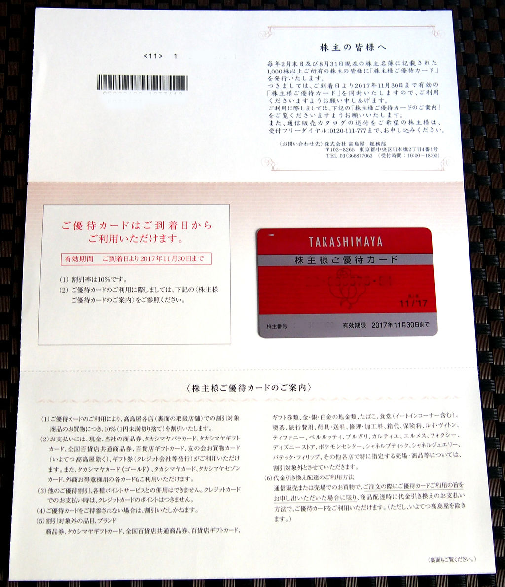 ところで、きょうは、老舗デパートの高島屋(8233)の株主優待が届いたのでそちらについてです。
