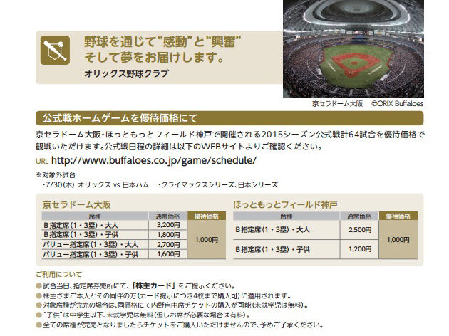 その他、3月末と9月末につく「株主優待カード」も野球観戦の割引などが出来て、京セラドームに近い関西の方にとってはすごく良いですよね。