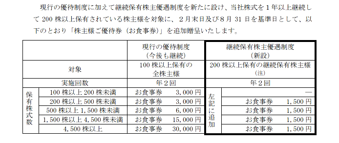 一方、同社の直近での最大のトピックスは、5月17日に発表した優待の拡充ですね。内容は、従来の優待に加えて、200株以上→1年以上継続保有で1500円分の食事券を追加で贈呈するというものですね。