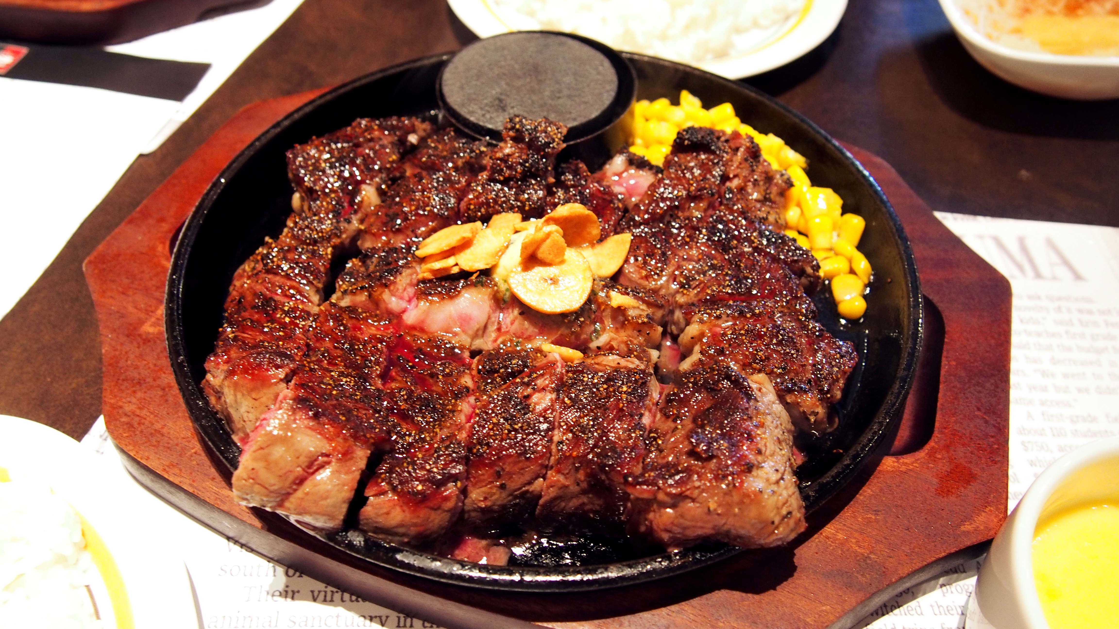 相方さんがよーく食べるのでステーキは半分食べてもらいました(*^-^*) 値段は1800円(税抜)。いちばん安い部位ですが、よく焼いて食べると、香ばしく食べ応え十分でした。
