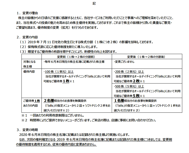 従来の優待の内容は、100株以上でレストラン「bills」のオーガニックスクランブルエッグ、リコッタパンケーキ、リングイーネ、チョップサラダから2品の無償提供とソフトドリンク2杯の無償提供でしたね。