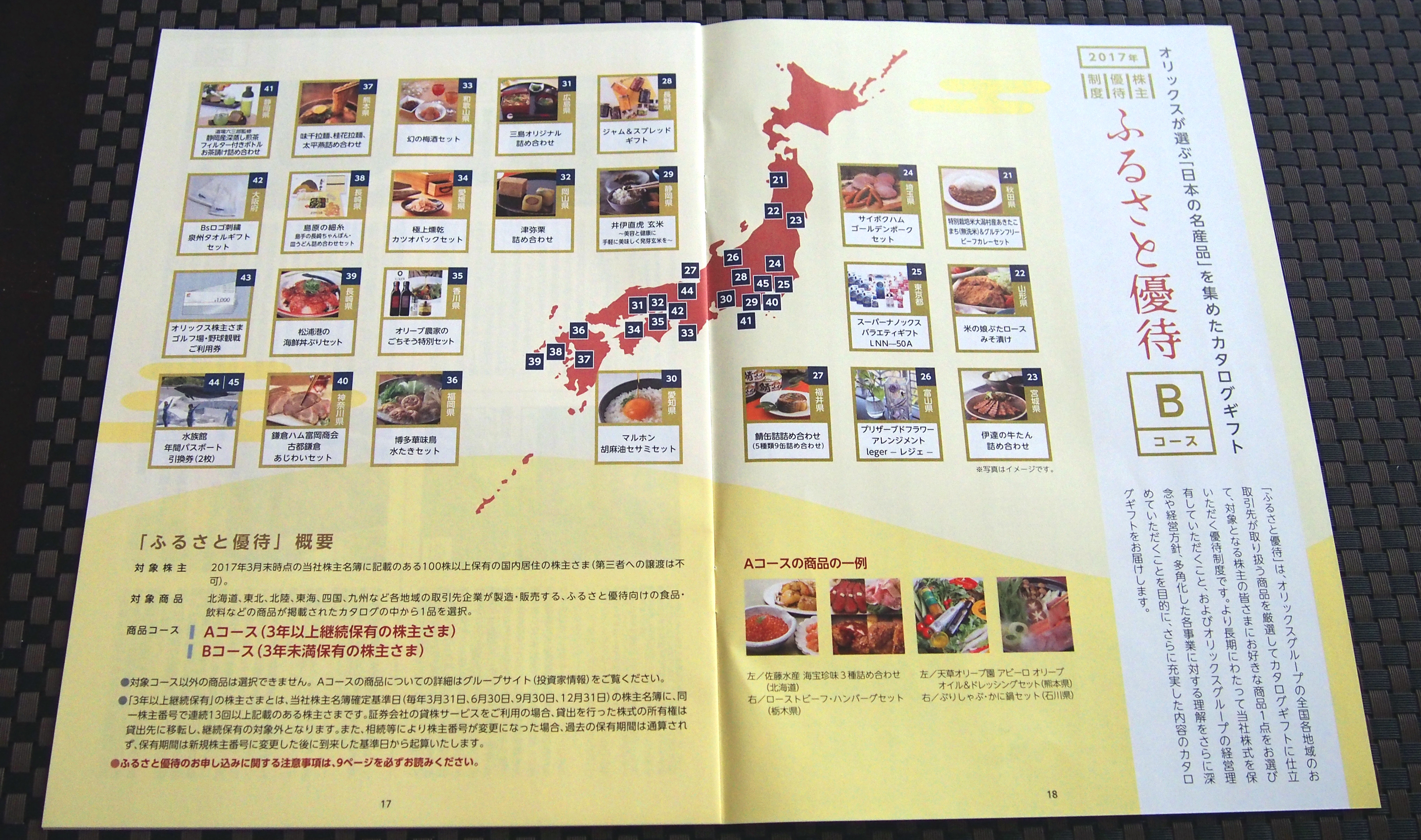 各地域の取引先企業が販売する食品・飲料など、Aコース15品、Bコース25品程度が掲載されたカタログの中から1品(3年以上継続保有:Aコース、3年未満保有:Bコース)を選択