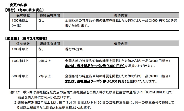 従来の100株以上→3000円相当のカタログギフトに加えて、中長期保有制度が新設され、2年以上継続保有→「自社製品のクーポン券(同社店舗かアイコムダイレクトで使用可)」かどちらかを選択する形になりますね。