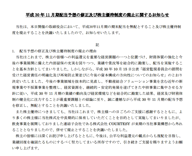同社は衝撃的な優待拡充など人気優待の代表といってもよいほど人気を集めた優待銘柄でしたが、今年7月の粉飾決算疑惑や第三者委員会の設置等(株価急落・有価証券報告書の訂正等)の流れから不透明感が渦巻いていました。