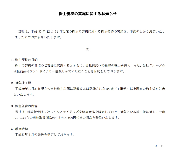 一方、新設優待の内容は、12月末権利で、100株以上→同社が鍼灸接骨院に対し販売 しているヘルスケアグッズや健康食品4000円相当ということですね。