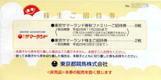 まず、同社の優待の内容は、1000株以上(取得額26万円くらい)→①東京サマーランドの招待券(通年利用可)2枚②東京サマーランドの春秋招待券(7、8月利用不可)8枚③大井競馬場株主優待証(入場パス) がもらえますね(^^♪