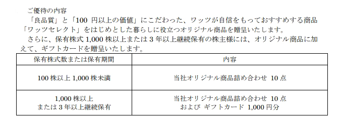 きょうは、「ワッツ」や「ミーツ」「シルク」などの100円ショップチェーンを展開するワッツ(2735)の株主優待についてです。