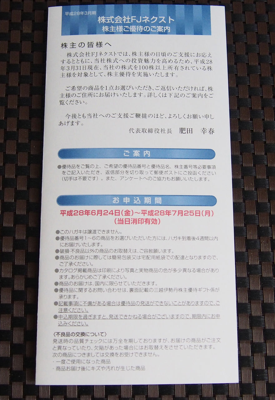 もし、これで優待品が届いたら、FJネクストとカタログギフトの委託先の三越伊勢丹センターは素晴らしい・・・となるかいかに。