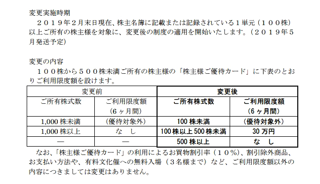 一方、昨年7月24日に、優待の変更と2018年9月1日を効力発生日とする単元株変更(1000株⇒100株)と、2株⇒1株の株式併合が発表され、2019年2月末権利分より、100株以上→10%割引株主優待カード(利用制限30万円)、500株以上→同カード(利用制限なし)の2段階に設定されることになりましたね。