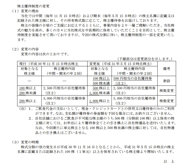 一方、同社の大きなトピックスは、昨年10月30日に発表された株式分割と優待制度の変更ですね。まず、11月15日現在の株主を対象に1→5の株式分割を実施し、それに伴い100株以上→500円相当(新設)の自社優待券を贈呈するということですね。