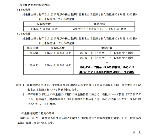 従来は3月20日権利で、100株以上→1000円のクオカードでしたが、新たに長期保有制度を新設し、3年以上保有でクオカード1000円分に加え、自社グループ製品5000円相当or選べるギフト3000円相当分のいずれかを贈呈するということですね。