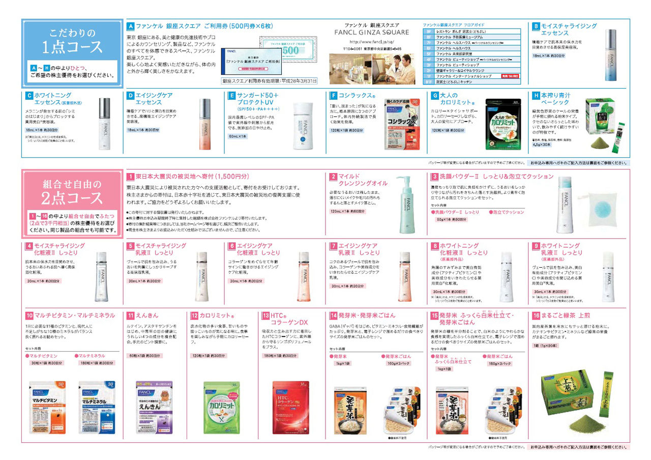 こちらの優待は、100株で3000円相当の自社製品かファンケル銀座スクエアで使える商品券(利用券:3000円分)を選べるんですね。女性の方にはかなり魅了的な優待ですよね。