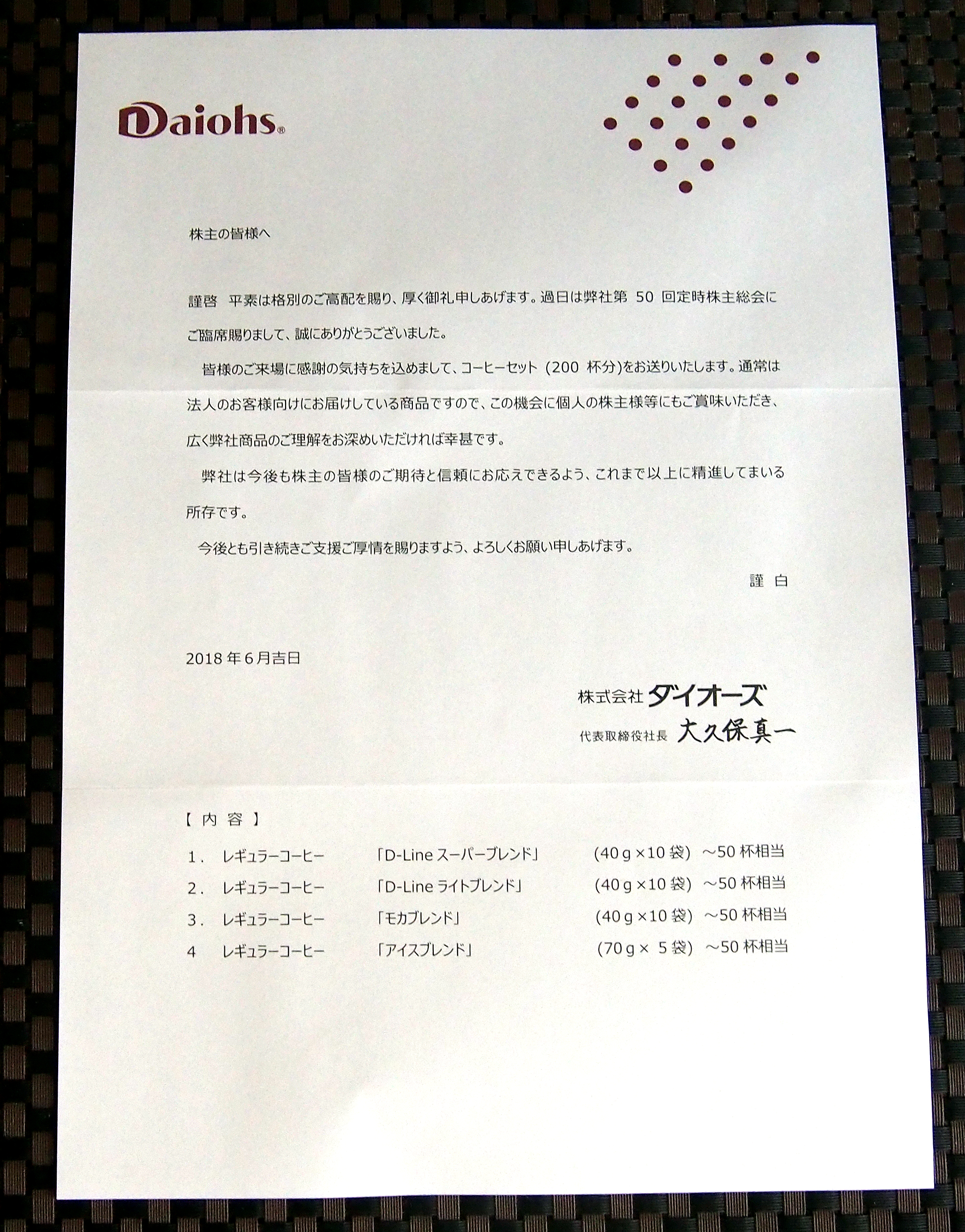 ところできょうは、先日、オフィスコーヒーサービス国内最大手のダイオーズ(4653)から待望の株主総会のお土産が届いたのでそちらについてです。