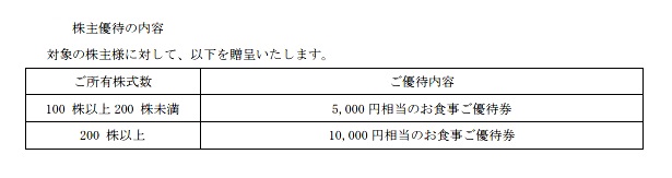 まず、新設優待の内容は、3月と9月権利で、100株→5000円相当、1000株以上→10000円相当の優待食事券ですね(*^-^*)
