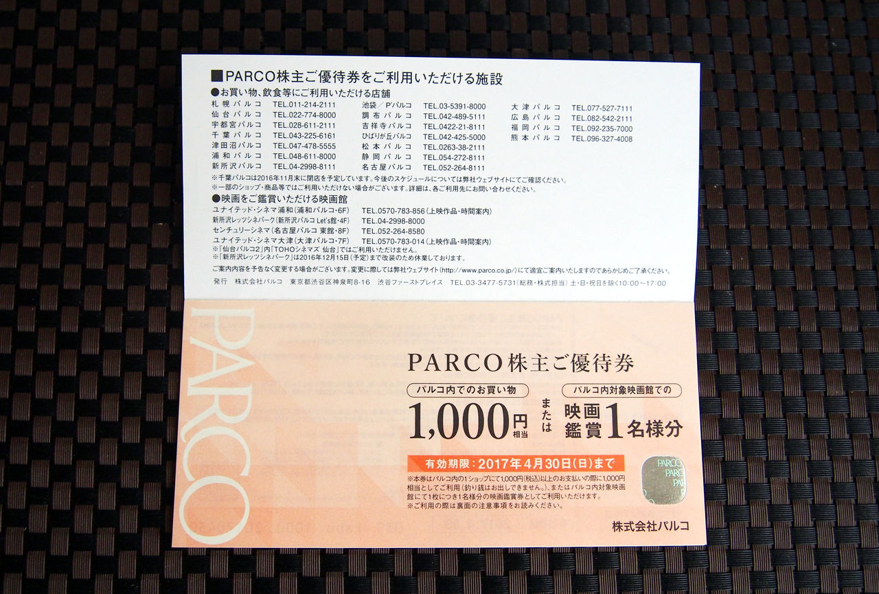 ところで、きょうは、昨日気づいた、今月末で期限が切れる8月権利分でいただいたパルコ(8251)の優待についてです。